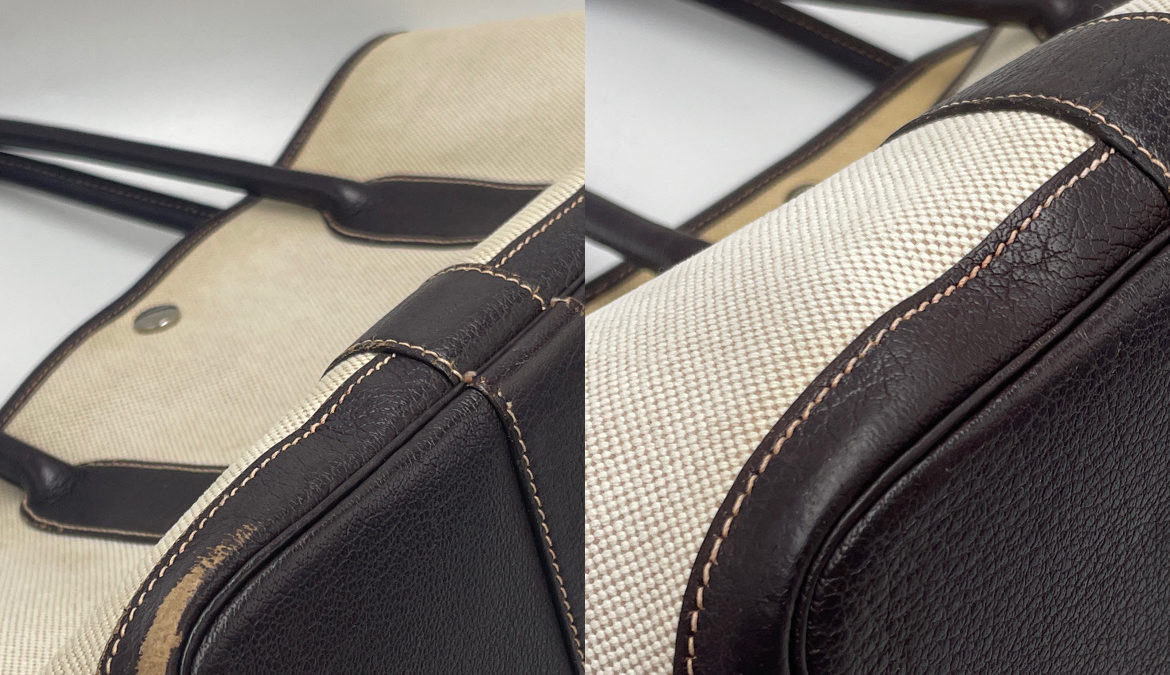 ガーデンパーティ(特にキャンバス素材)の黄ばみは、汚れではなく「素材の劣化・変色」であることが多いです。また、革の角スレは「色の剥げ」です。